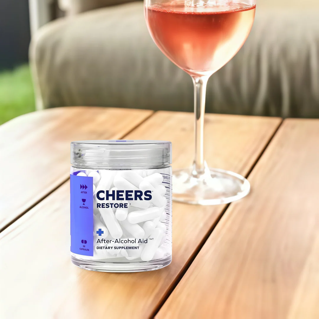 Cheers Restore is a patented formula (Granted Patent: US 9,603,830 B2) designed specifically to help you feel better after drinking. It works by reducing GABAa rebound, replacing lost vitamins, and providing your liver with what it needs to break down alcohol and its toxic by-products. Just take2-4 capsules after your last alcoholic beverage or before going to bed, and wake up feeling at least 50% !